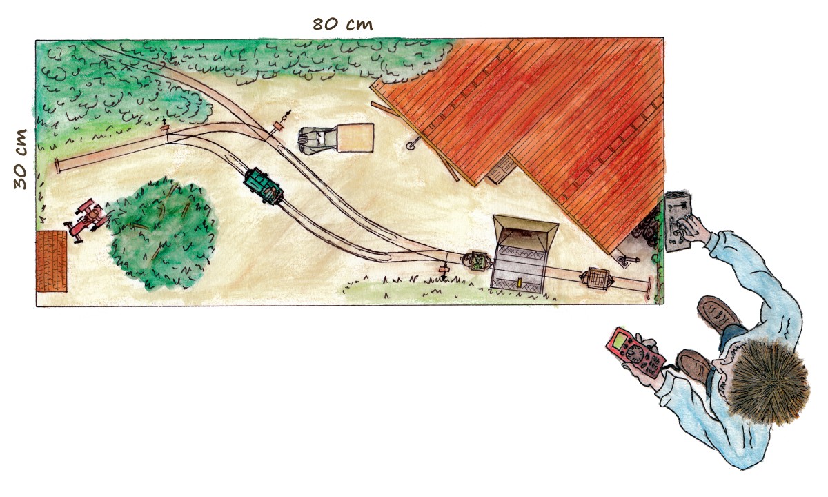 Le réseau est construit à l'échelle 1/43,5ème et à l'écartement de 14mm (O14), dans un caisson en MDF de 80cm de long et de 30 cm de profondeur.