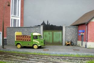 Les deux locotracteurs sont des modèles Davenport de chez BACHMANN modifiés. Le parc de wagon est de construction personnelle sur base de châssis HO et de carte plastique.